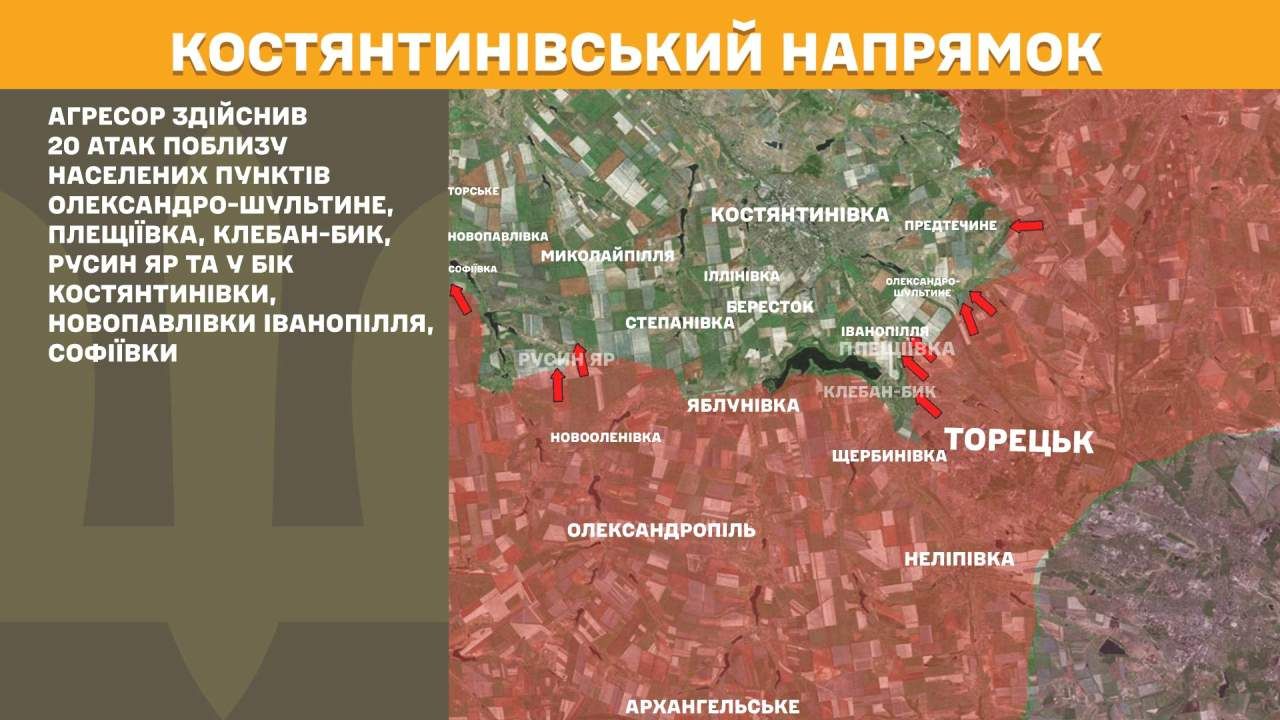 На Костянтинівському напрямку агресор здійснив 20 атак поблизу населених пунктів Олександро-Шультине, Плещіївка, Клебан-Бик, Русин Яр та у бік Костянтинівки, Новопавлівки Іванопілля, Софіївки.