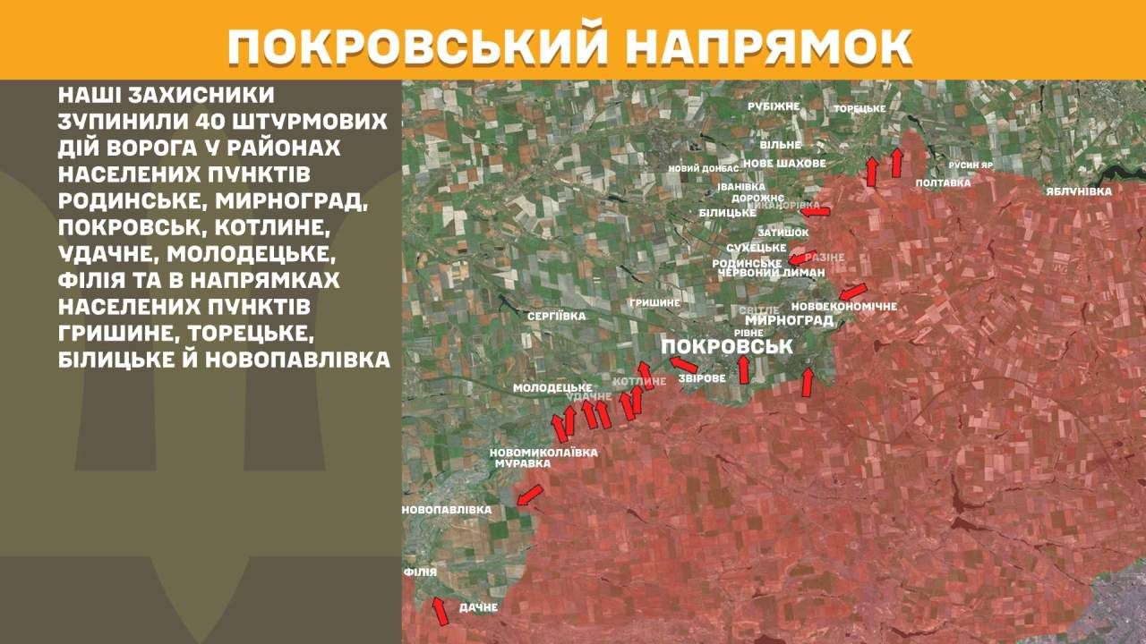 На Покровському напрямку наші захисники зупинили 40 штурмових дій ворога у районах населених пунктів Родинське, Мирноград, Покровськ, Котлине, Удачне, Молодецьке, Філія та в напрямках населених пунктів Гришине, Торецьке, Білицьке й Новопавлівка.