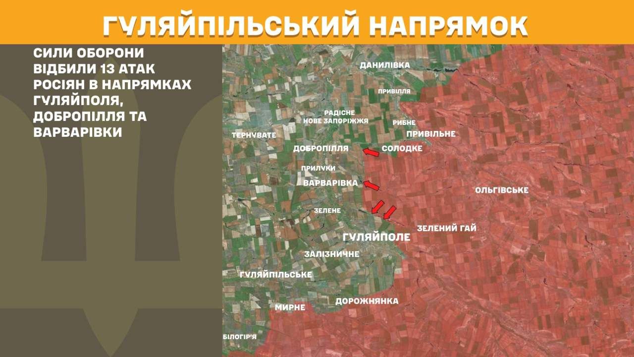 На Гуляйпільському напрямку Сили оборони відбили 13 атак росіян в напрямках Гуляйполя, Добропілля та Варварівки.
