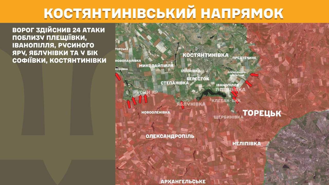 На Костянтинівському напрямку ворог здійснив 24 атаки поблизу Плещіївки, Іванопілля, Русиного Яру, Яблунівки та у бік Софіївки, Костянтинівки.