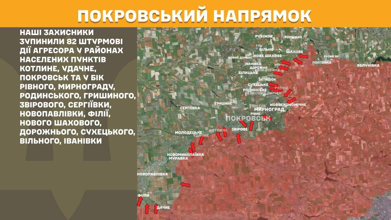 На Покровському напрямку наші захисники зупинили 82 штурмові дії агресора у районах населених пунктів Котлине, Удачне, Покровськ та у бік Рівного, Мирнограду, Родинського, Гришиного, Звірового, Сергіївки, Новопавлівки, Філії, Нового Шахового, Дорожнього, Сухецького, Вільного, Іванівки.