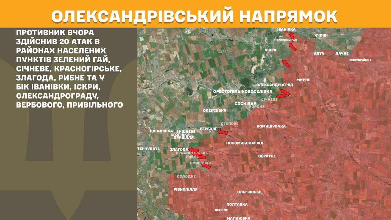На Олександрівському напрямку противник вчора здійснив 20 атак в районах населених пунктів Зелений Гай, Січневе, Красногірське, Злагода, Рибне та у бік Іванівки, Іскри, Олександрограду, Вербового, Привільного.