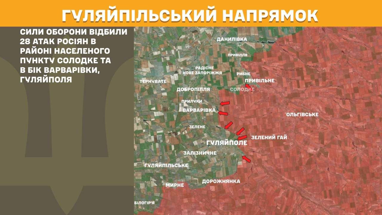На Гуляйпільському напрямку Сили оборони відбили 28 атак росіян в районі населеного пункту Солодке та в бік Варварівки, Гуляйполя.