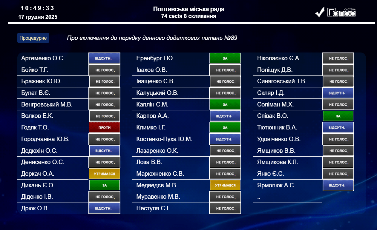 17 грудня о 10-й годині має розпочатися онлайн-засідання позачергової 74-ї сесії Полтавської міської ради 8-го скликання.