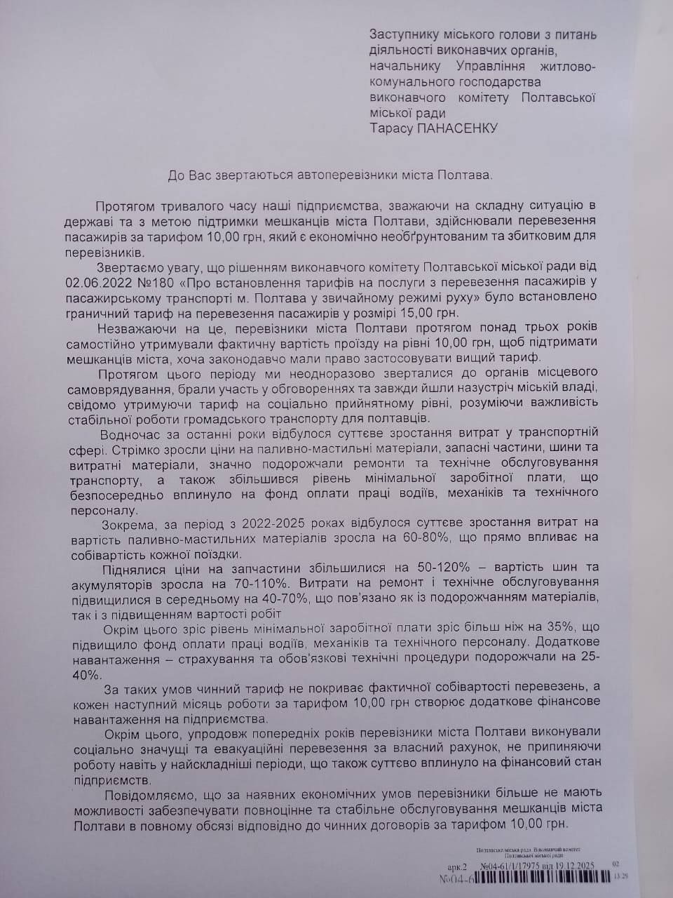 За словами перевізників, нинішня вартість проїзду не покриває витрат на стабільну роботу громадського транспорту. У своїй вимозі вони посилаються на рішення виконкому Полтавської міськради від 2 червня 2022 року, яким тариф на проїзд було встановлено на рівні до 15 гривень. У міській раді водночас зазначають, що це рішення ухвалили за попереднього складу виконавчого комітету.