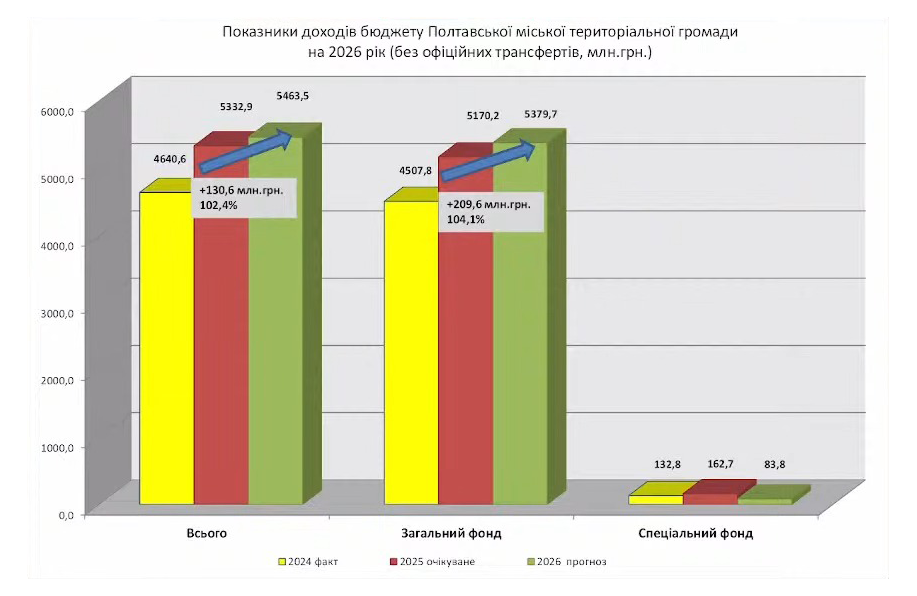 Щодо показників доходів: очікуваний результат станом на 21 грудня цього року — 5 млрд 332 млн грн, а прогноз на 2026 рік становить 5 млрд 463 млн грн. Тобто, наступного року Полтава отримає на 130,6 млн грн більше, або на 2,4%. Для обласного центру таке збільшення є досить формальним і свідчить про те, що місто залишиться мінімум на нинішньому рівні. А якщо врахувати інфляцію — мова вже йде про падіння реальних доходів.
