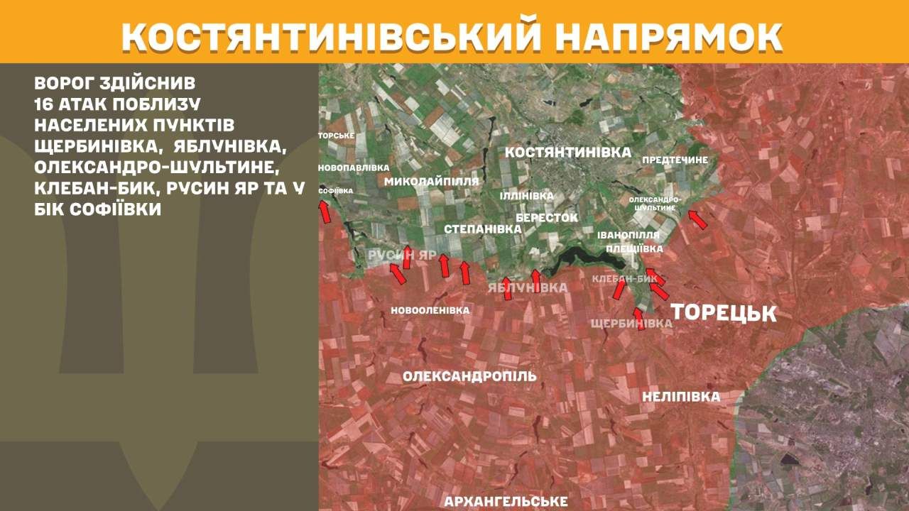На Костянтинівському напрямку ворог здійснив 16 атак поблизу населених пунктів Щербинівка, Яблунівка, Олександро-Шультине, Клебан-Бик, Русин Яр та у бік Софіївки.