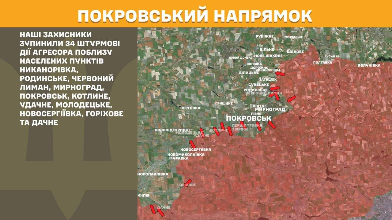 На Покровському напрямку наші захисники зупинили 34 штурмові дії агресора поблизу населених пунктів Никанорівка, Родинське, Червоний Лиман, Мирноград, Покровськ, Котлине, Удачне, Молодецьке, Новосергіївка, Горіхове та Дачне.