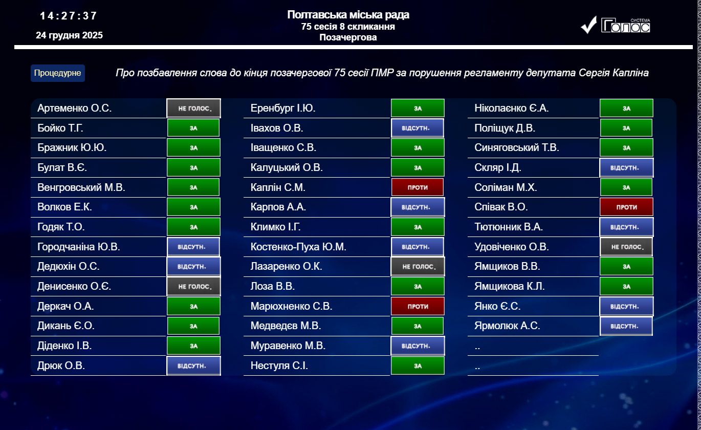 14:27 — З подачі депутата Євгена Диканя Сергія Капліна позбавили слова до кінця сесії. Причина — образи та використання нецензурної лексики.