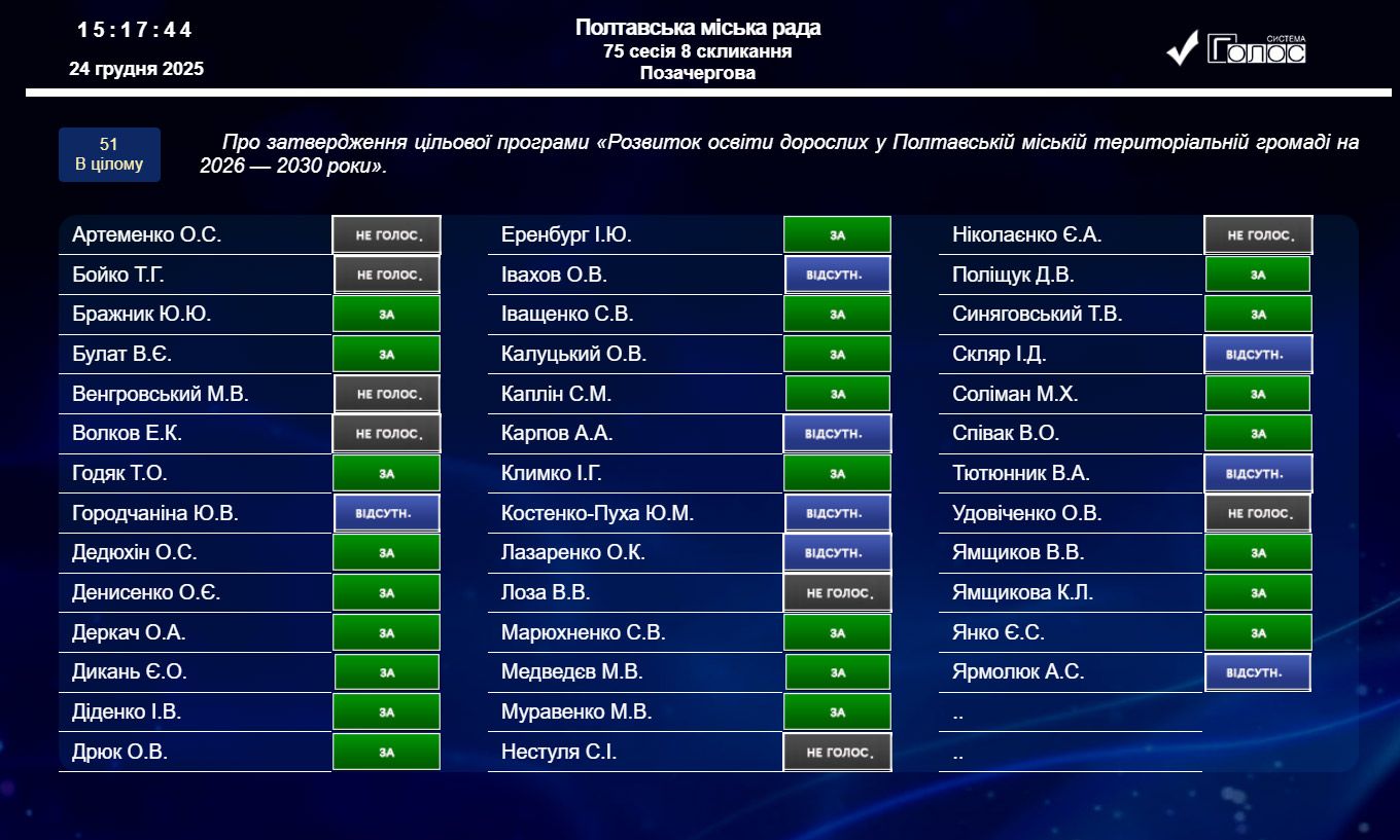 - 51) Про затвердження цільової програми «Розвиток освіти дорослих у Полтавській міській територіальній громаді на 2026-2030 роки».