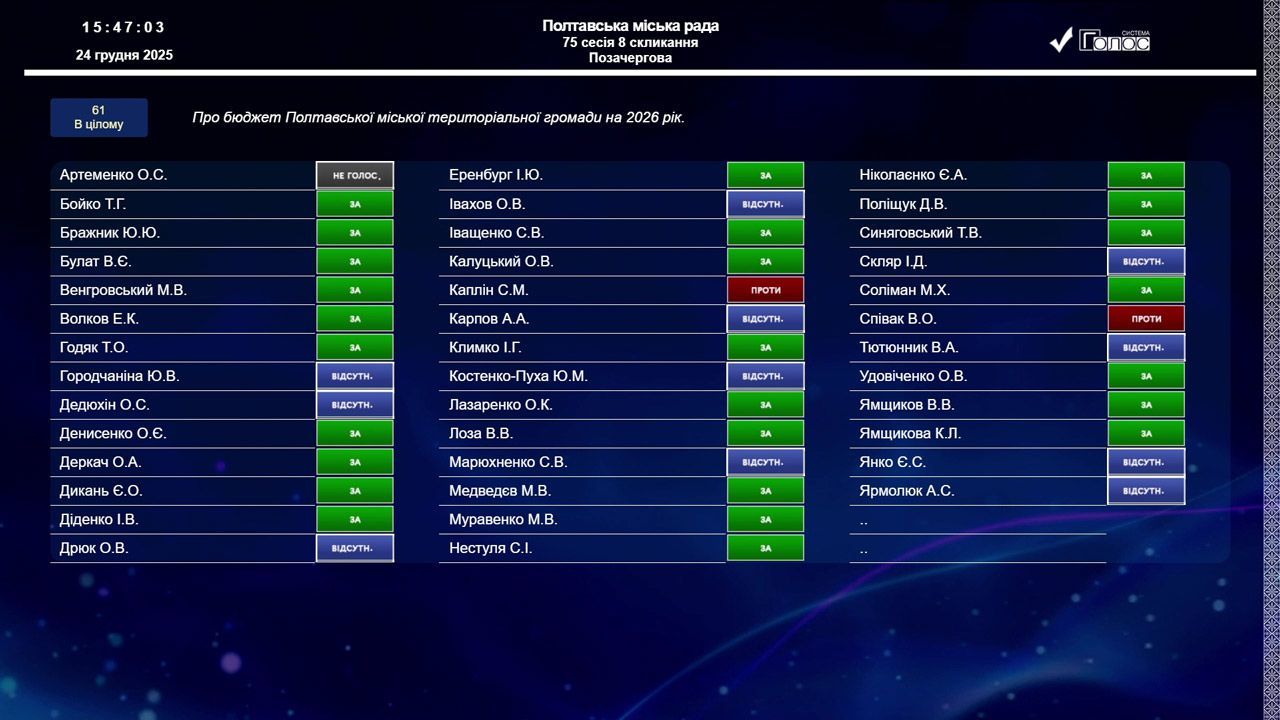 24 грудня під час позачергової 75-ї сесії депутати міської ради затвердили бюджет Полтавської громади на 2026 рік.
