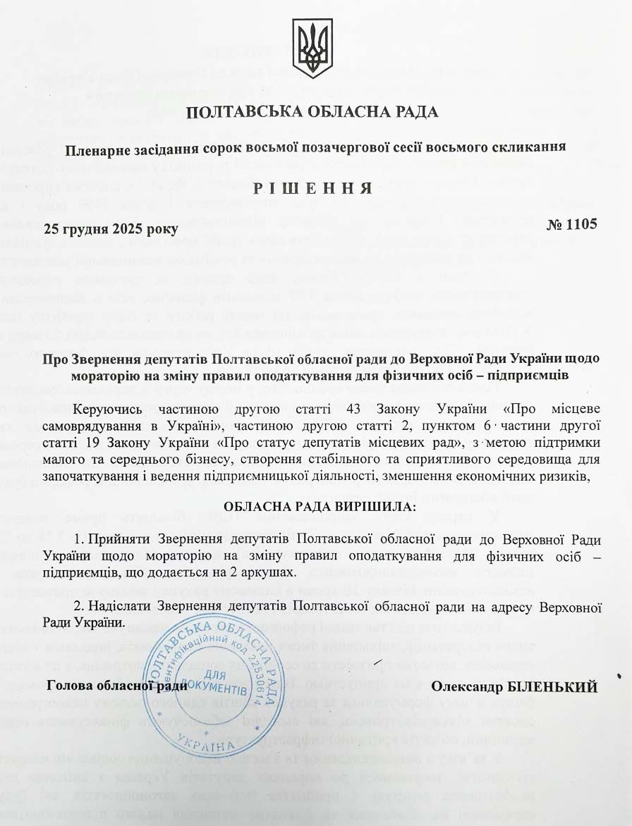 25 грудня під час сесії Полтавської обласної ради депутати підтримали ініціативу голови фракції «Батьківщина» Сергія Бєлашова щодо звернення до Верховної Ради України з метою недопущення запровадження додаткового податкового навантаження на малий та середній бізнес.