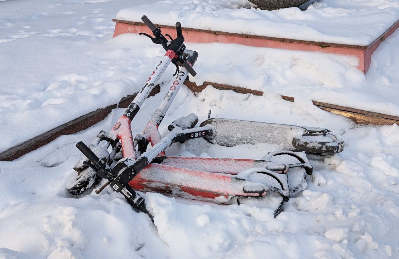Власники сервісів прокату JET та Rooh після початку зими не забрали свій транспорт із вулиць. Електросамокати залишили просто неба, де вони припадають снігом і псуються.