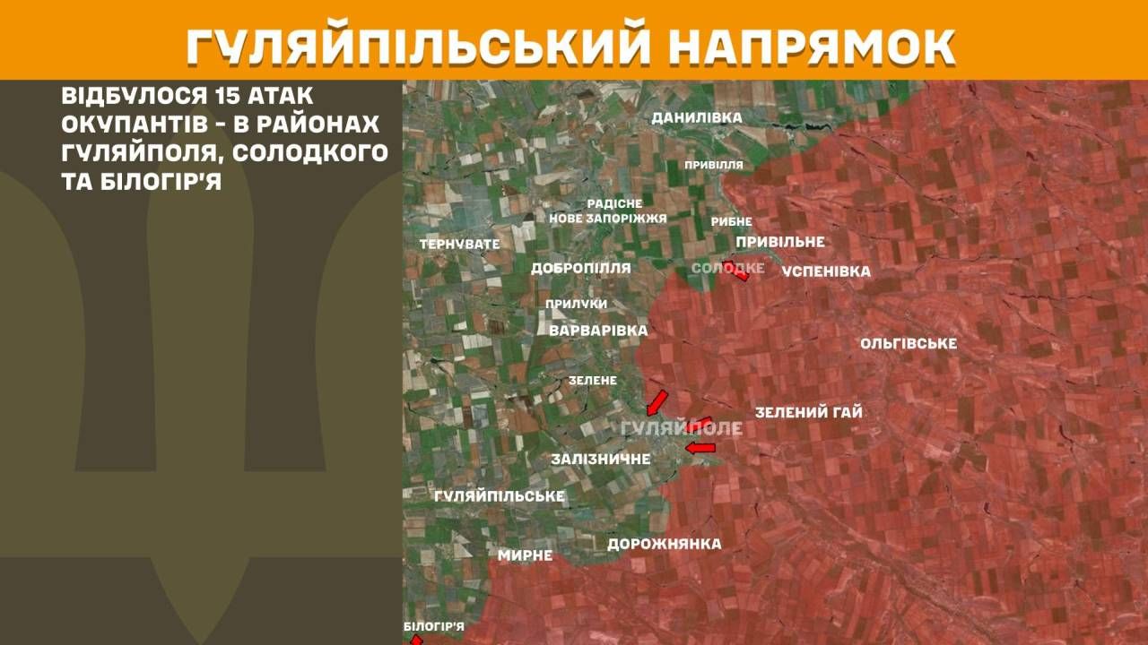 На Гуляйпільському напрямку відбулося 15 атак окупантів — в районах Гуляйполя, Солодкого та Білогір’я.