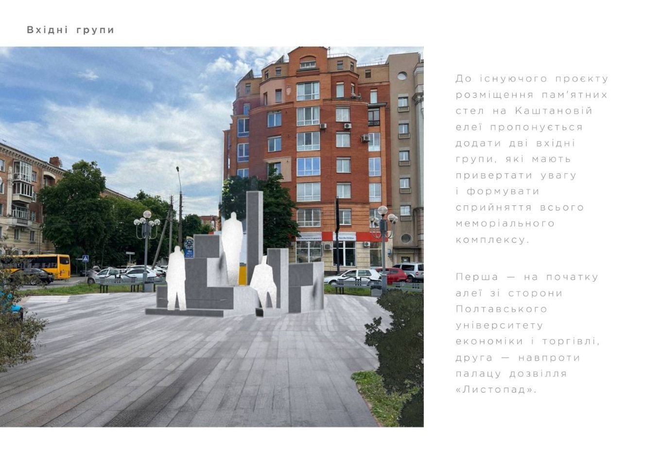 Влітку минулого року в межах проєкту «Полтава пам’ятає Героїв» дизайнер Тарас Руденко представив попередні ескізи вхідної групи, яка має привертати увагу до меморіального комплексу на Каштановій алеї. Одне з можливих розташувань фігур вхідної групи передбачено на місці занедбаного МАФу у формі годинника, який стоїть напроти ПД «Листопад». Ще одне розташування — на початку алеї зі сторони Полтавського університету економіки та торгівлі. Остаточного ескізу скульптур вхідної групи на Алеї Героїв у Полтаві досі не визначено.