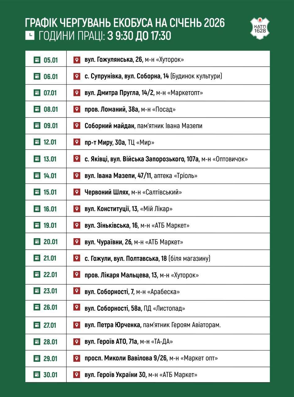 Графік зупинок екобуса на січень 2026 року в Полтавській громаді (перелік адрес)
