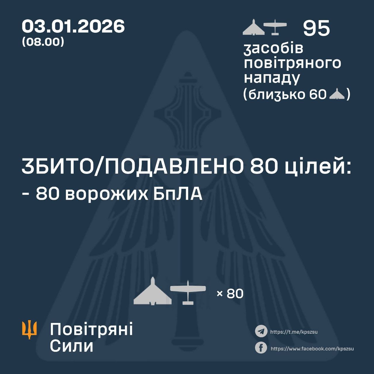 За попередніми даними, станом на 08:00, протиповітряною обороною збито/подавлено 80 ворожих БпЛА типу Shahed, Гербера і дронів інших типів на півночі, півдні та сході країни.