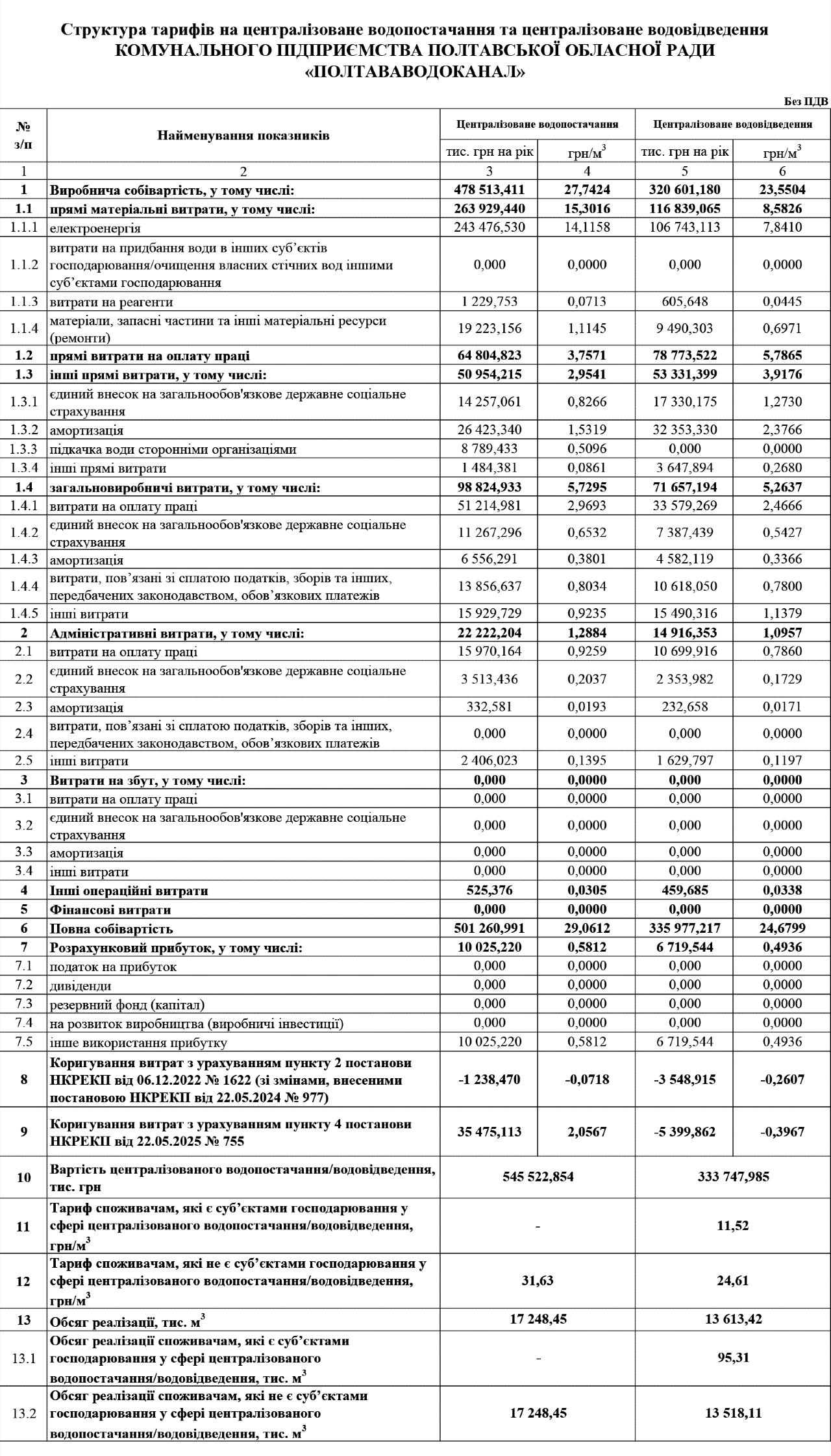 - Водопостачання: 31,63 грн без ПДВ (37,96 грн з ПДВ);