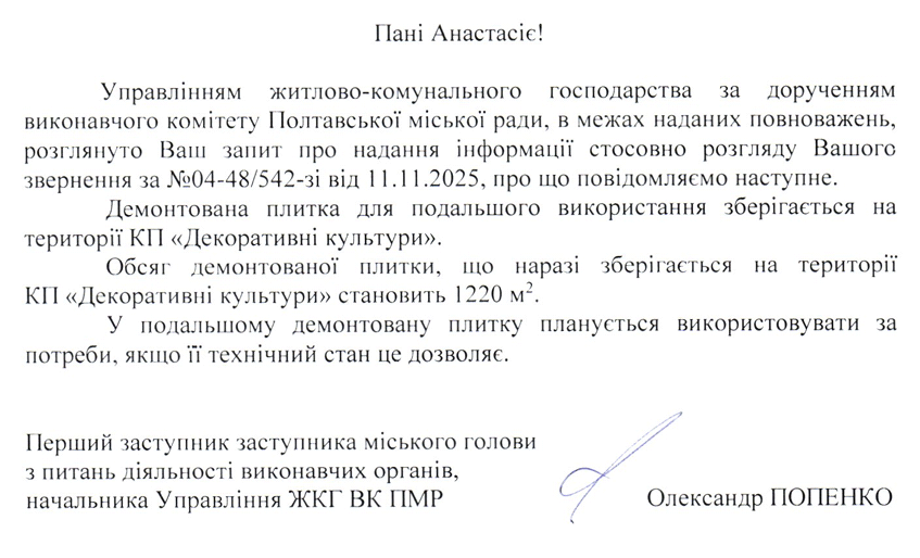 Як стало відомо «Полтавщині» з офіційної відповіді Управління житлово-комунального господарства на запит, станом на 20 листопада 2025 року демонтована плитка зберігається на складі КП «Декоративні культури». Згідно з документами, обсяг бруківки на складі комунального підприємства зараз становить 1220 м².