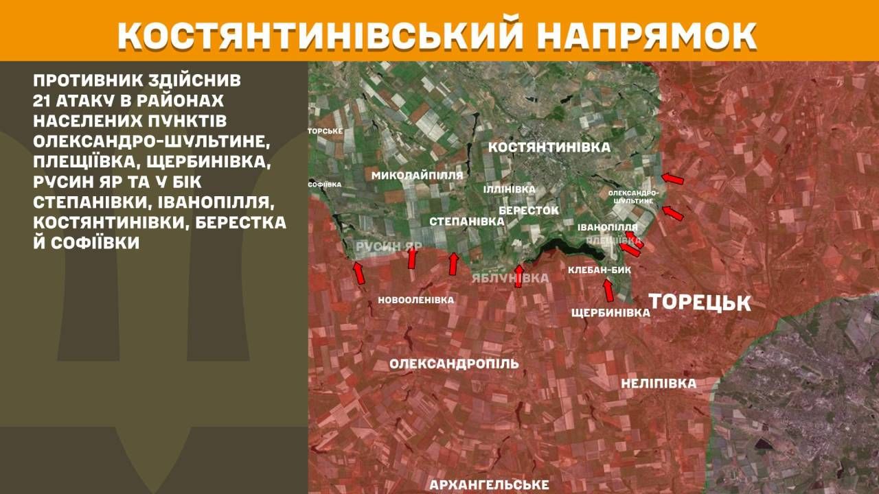 На Костянтинівському напрямку противник здійснив 21 атаку в районах населених пунктів Олександро-Шультине, Плещіївка, Щербинівка, Русин Яр та у бік Степанівки, Іванопілля, Костянтинівки, Берестка й Софіївки.