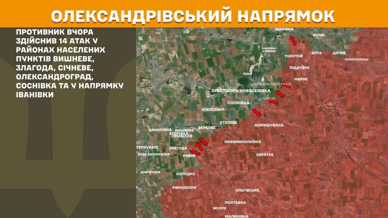 На Олександрівському напрямку противник вчора здійснив 14 атак у районах населених пунктів Вишневе, Злагода, Січневе, Олександроград, Соснівка та у напрямку Іванівки.