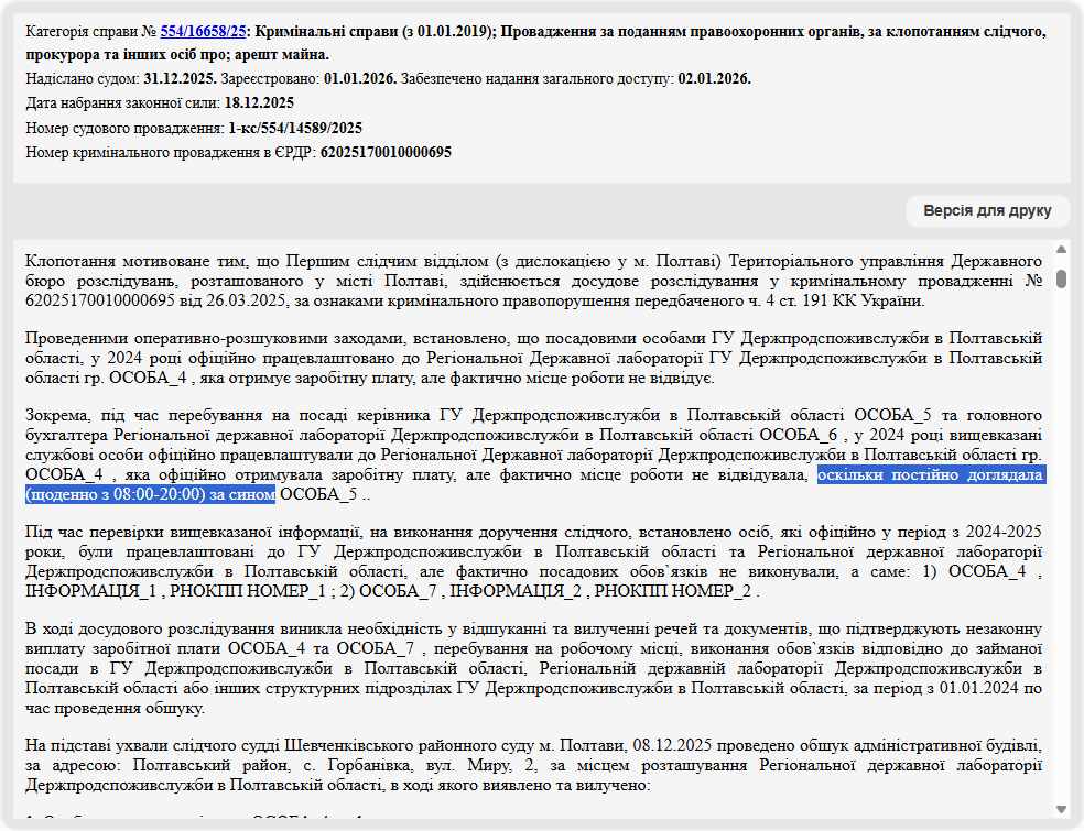 З Єдиного державного реєстру судових рішень відомо, що під час оперативно-розшукових заходів детективи Держбюро розслідувань встановили: у 2024 році начальниця ГУ Держпродспоживслужби Полтавщини та головна бухгалтерка Регіональної державної лабораторії Держпродспоживслужби офіційно працевлаштували громадянку, яка отримувала заробітну плату, але фактично робоче місце не відвідувала, оскільки постійно з 8:00 до 20:00 доглядала за сином керівниці обласної Держпродспоживслужби.