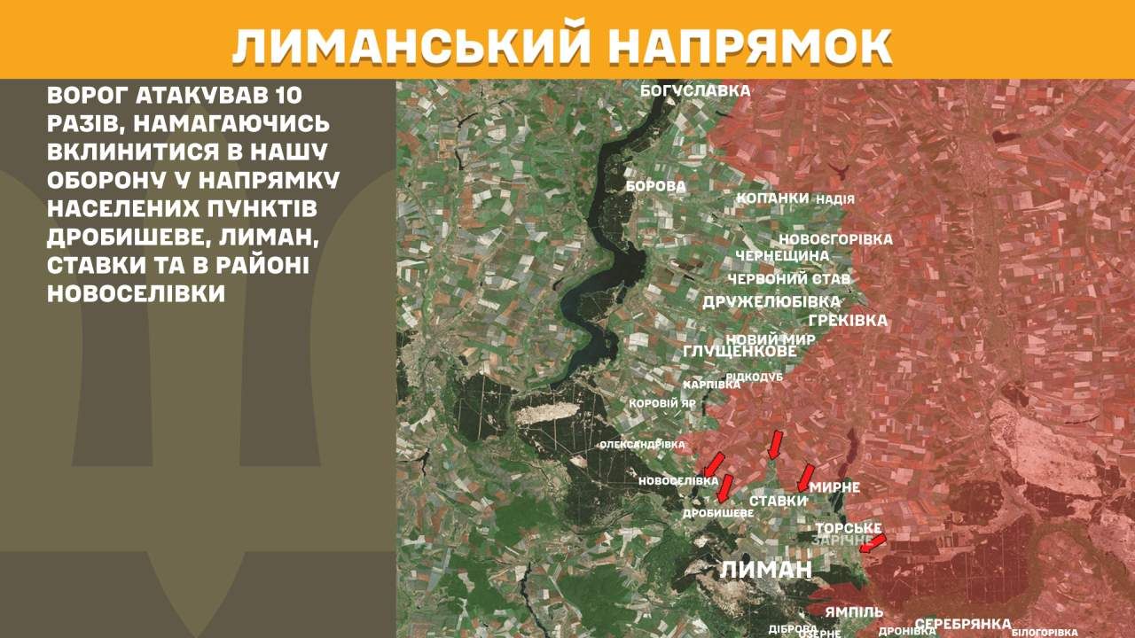 На Лиманському напрямку ворог атакував 10 разів, намагаючись вклинитися в нашу оборону у напрямку населених пунктів Дробишеве, Лиман, Ставки та в районі Новоселівки.