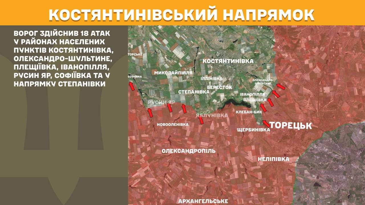 На Костянтинівському напрямку ворог здійснив 18 атак у районах населених пунктів Костянтинівка, Олександро-Шультине, Плещіївка, Іванопілля, Русин Яр, Софіївка та у напрямку Степанівки.