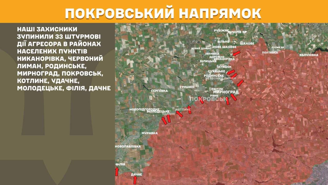 На Покровському напрямку наші захисники зупинили 33 штурмові дії агресора в районах населених пунктів Никанорівка, Червоний Лиман, Родинське, Мирноград, Покровськ, Котлине, Удачне, Молодецьке, Філія, Дачне.