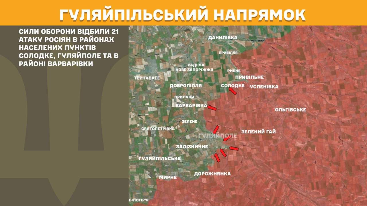 На Гуляйпільському напрямку Сили оборони відбили 21 атаку росіян в районах населених пунктів Солодке, Гуляйполе та в районі Варварівки.