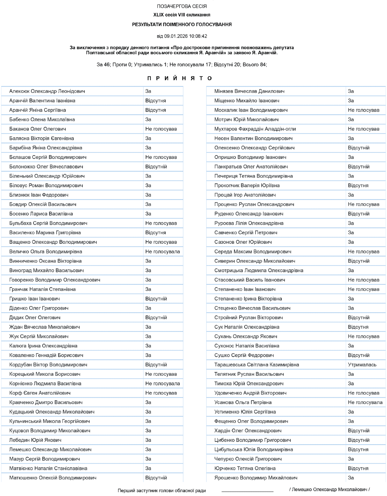 9 січня відбулася позачергова 49 сесія Полтавської облради. Порядок денний складався із двох питань: «Про дострокове припинення повноважень депутата Полтавської обласної ради восьмого скликання Я. Аранчій» та про звернення облради до Кабміну щодо ситуації навколо вимкнень критичних об’єктів. Якщо друге питання було результативним, то перше було знято депутатською більшістю за пропозицією самої Яніни Аранчій без будь-яких публічних пояснень.