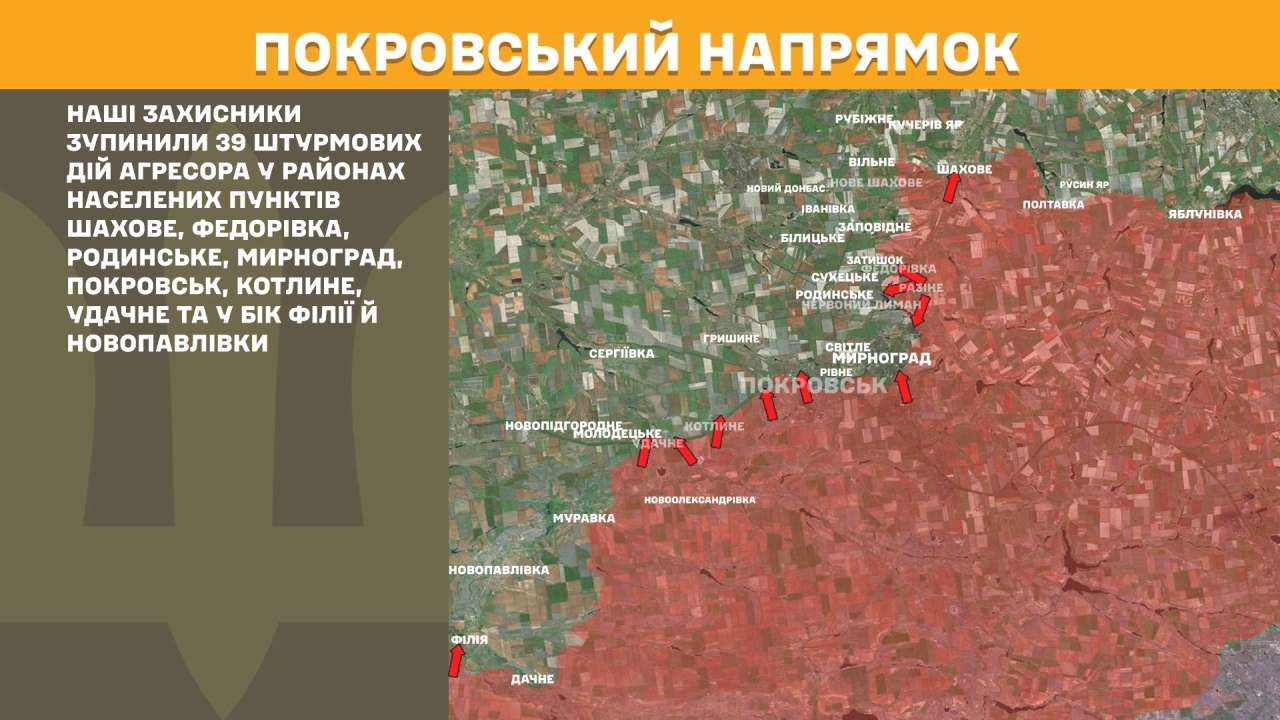 На Покровському напрямку наші захисники зупинили 39 штурмових дій агресора у районах населених пунктів Шахове, Федорівка, Родинське, Мирноград, Покровськ, Котлине, Удачне та у бік Філії й Новопавлівки.