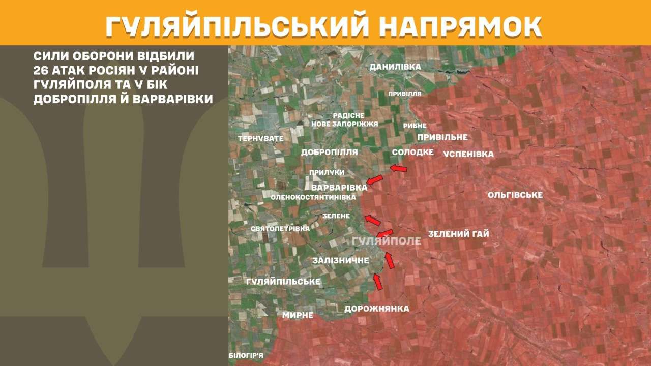 На Гуляйпільському напрямку Сили оборони відбили 26 атак росіян у районі Гуляйполя та у бік Добропілля й Варварівки.