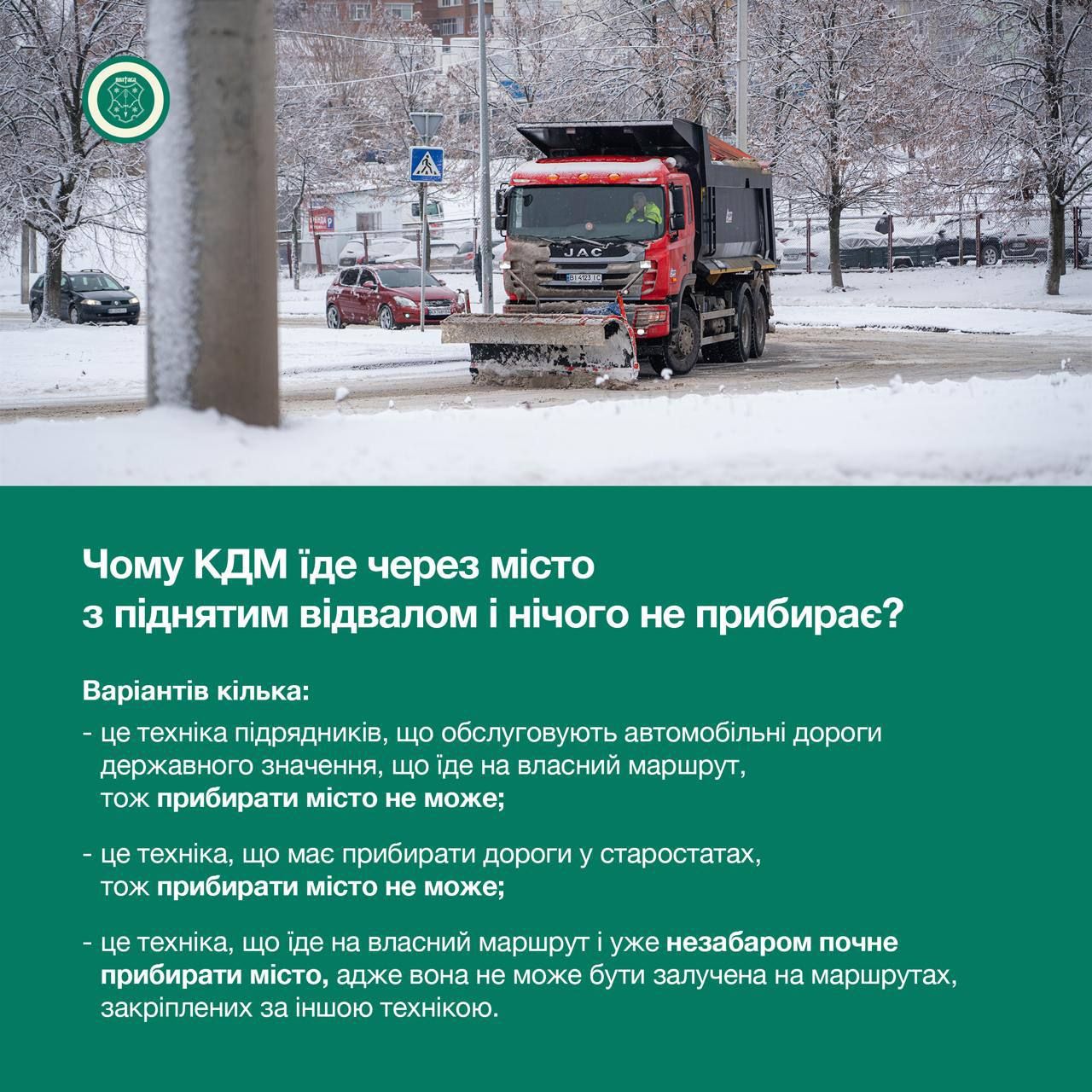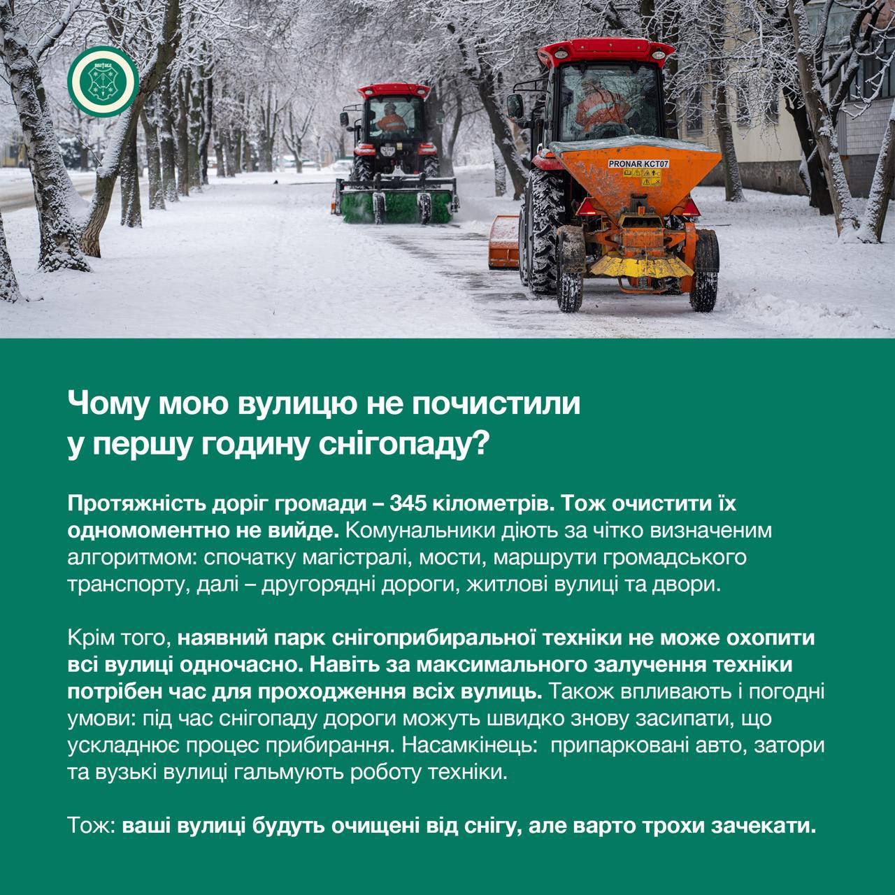 У міській раді пояснюють, що під час снігопадів прибирання відбувається за чітко визначеним алгоритмом: спочатку магістральні дороги, мости та маршрути громадського транспорту, далі — другорядні вулиці, житлові квартали та дворові проїзди. Одночасно очистити всі вулиці неможливо через протяжність дорожньої мережі та обмежену кількість техніки.