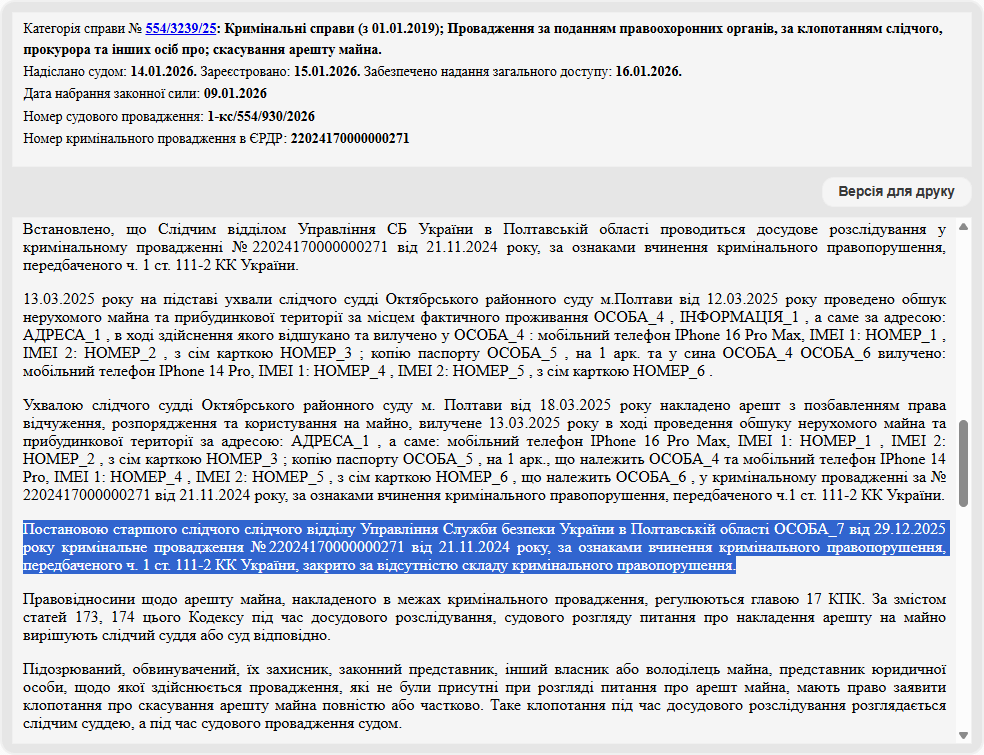Попри інформацію про можливе фінансування «воєнної іпотеки» в РФ та значний обсяг опрацьованих матеріалів, за весь час досудового слідства жодному з фігурантів справи так і не було оголошено про підозру. За результатами досудового розслідування слідчі регіонального управління Служби безпеки України дійшли висновку про відсутність доказів вчинення злочину. Наприкінці 2025 року кримінальне провадження було офіційно закрито. Про це відомо з Єдиного держреєстру судових рішень.