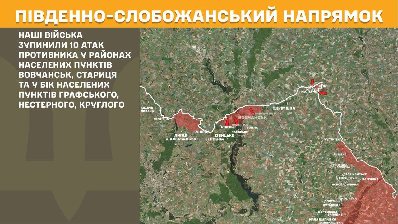 На Південно-Слобожанському напрямку наші війська зупинили 10 атак противника у районах населених пунктів Вовчанськ, Стариця та у бік населених пунктів Графського, Нестерного, Круглого.
