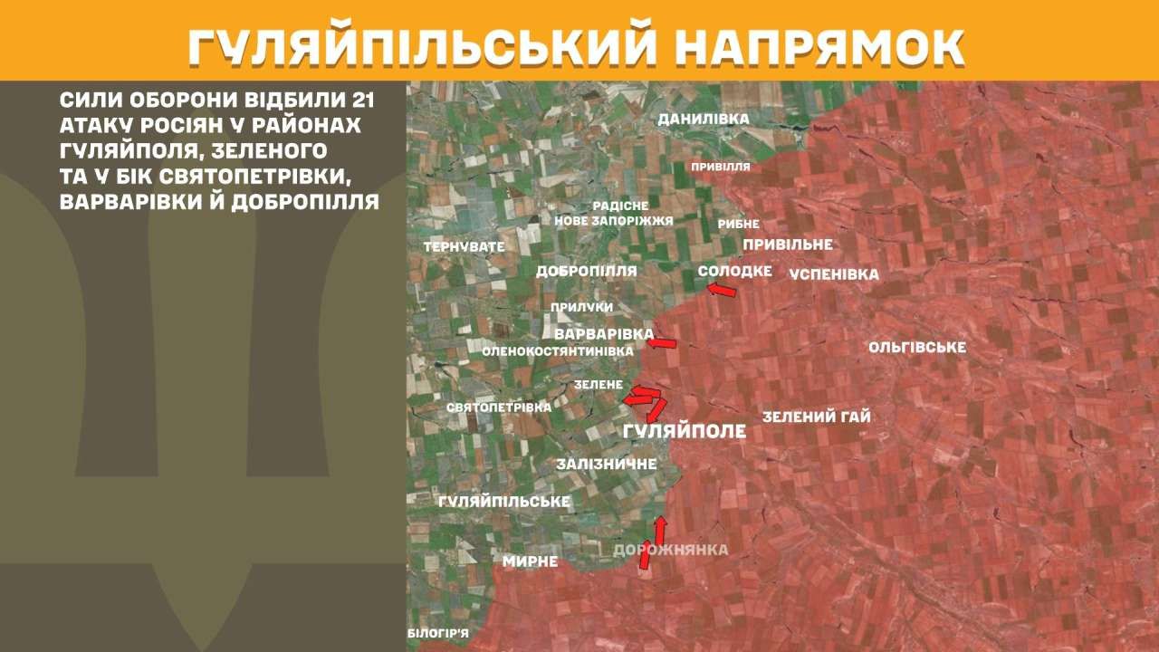 На Гуляйпільському напрямку Сили оборони відбили 21 атаку росіян у районах Гуляйполя, Зеленого та у бік Святопетрівки, Варварівки й Добропілля.