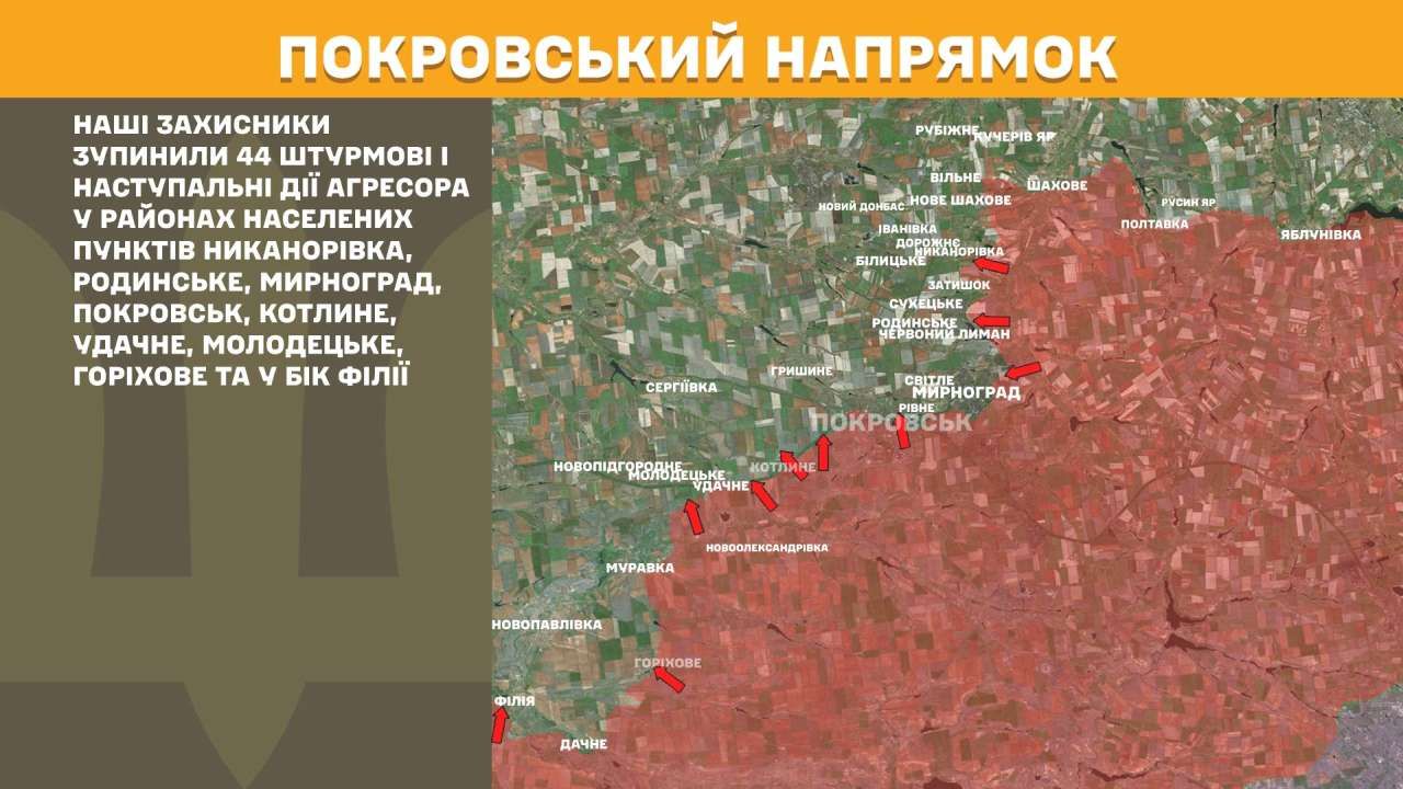 На Покровському напрямку наші захисники зупинили 44 штурмові і наступальні дії агресора у районах населених пунктів Никанорівка, Родинське, Мирноград, Покровськ, Котлине, Удачне, Молодецьке, Горіхове та у бік Філії.