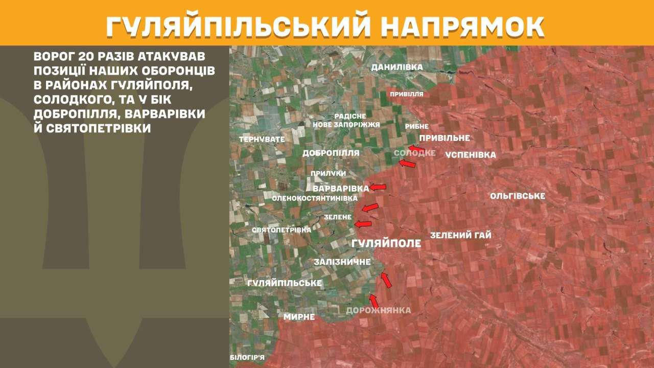 На Гуляйпільському напрямку ворог 20 разів атакував позиції наших оборонців в районах Гуляйполя, Солодкого, та у бік Добропілля, Варварівки й Святопетрівки.
