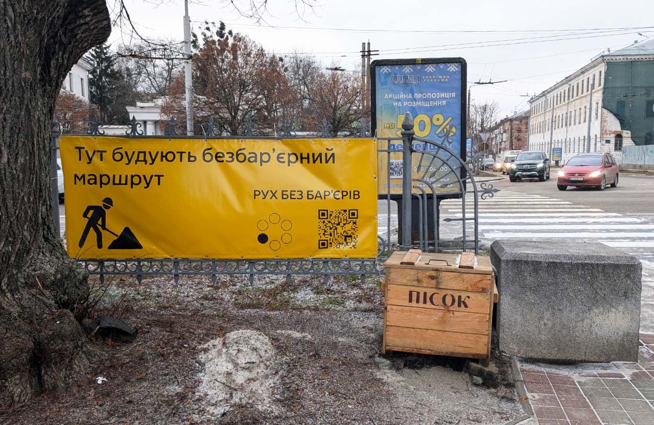 Через погодні умови в обласному центрі призупинили реалізацію першої черги безбар’єрного маршруту «Шлях ветерана», який презентували у травні минулого року. Наразі уклали тротуарну плитку біля Будинку зв’язку. Також роботи тривають біля Полтавської міської ради та поруч — у сквері й продовжать підготовку до укладання асфальту в Корпусному парку.