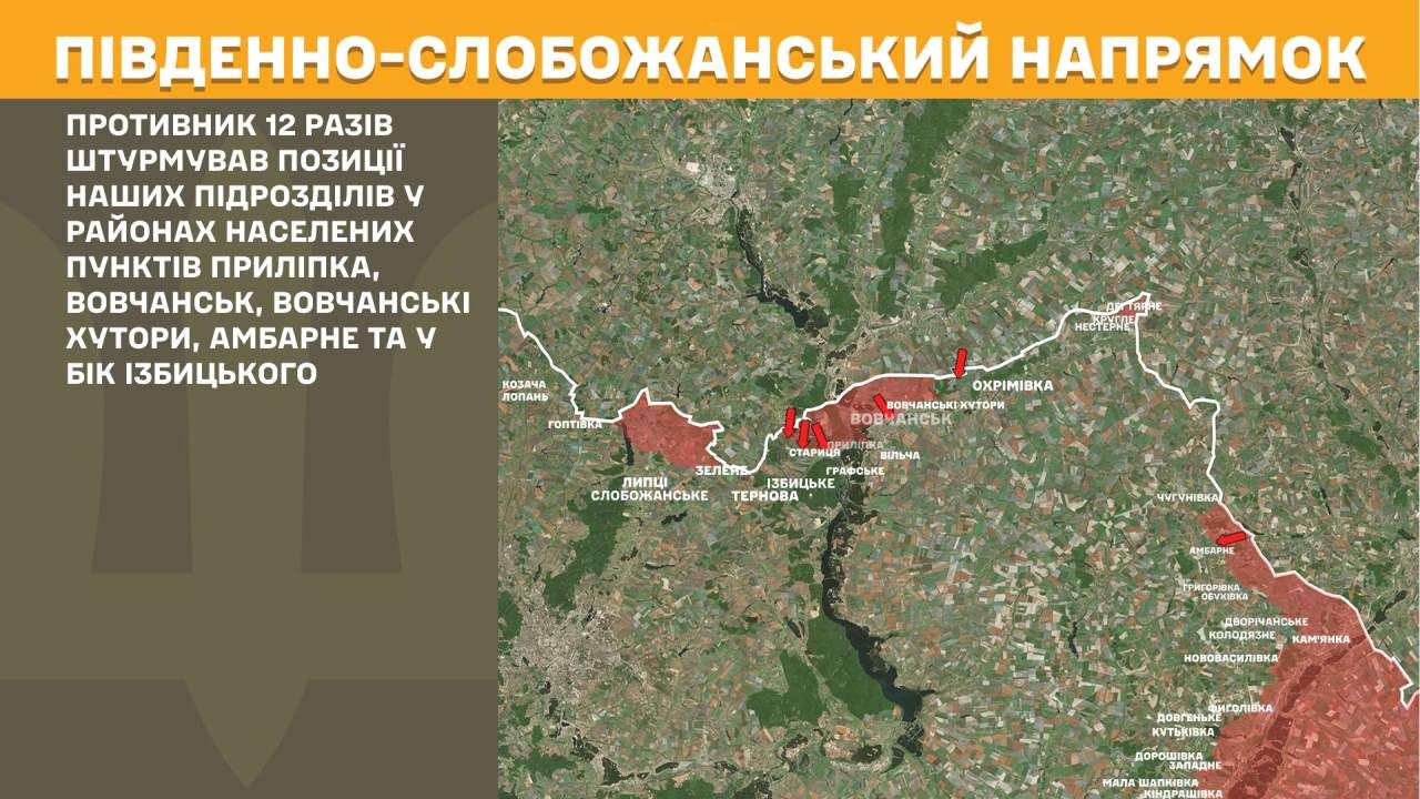 На Південно-Слобожанському напрямку противник 12 разів штурмував позиції наших підрозділів у районах населених пунктів Приліпка, Вовчанськ, Вовчанські Хутори, Амбарне та у бік Ізбицького.