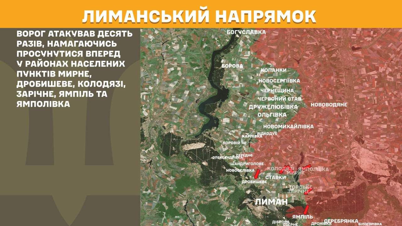 На Лиманському напрямку ворог атакував десять разів, намагаючись просунутися вперед у районах населених пунктів Мирне, Дробишеве, Колодязі, Зарічне, Ямпіль та Ямполівка.