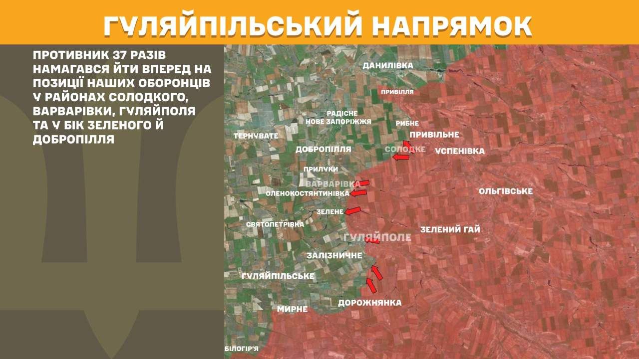 На Гуляйпільському напрямку противник 37 разів намагався йти вперед на позиції наших оборонців у районах Солодкого, Варварівки, Гуляйполя та у бік Зеленого й Добропілля.