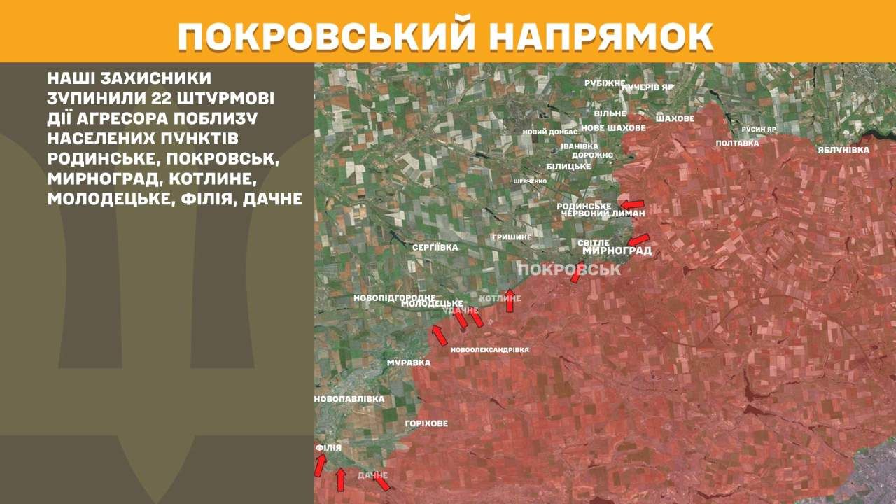 На Покровському напрямку наші захисники зупинили 22 штурмові дії агресора поблизу населених пунктів Родинське, Покровськ, Мирноград, Котлине, Молодецьке, Філія, Дачне.
