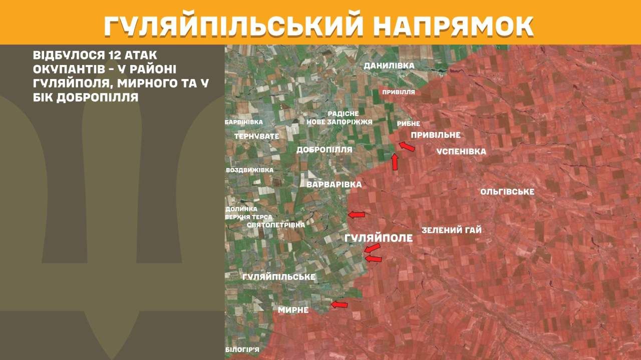 На Гуляйпільському напрямку відбулося 12 атак окупантів - у районі Гуляйполя, Мирного та у бік Добропілля.