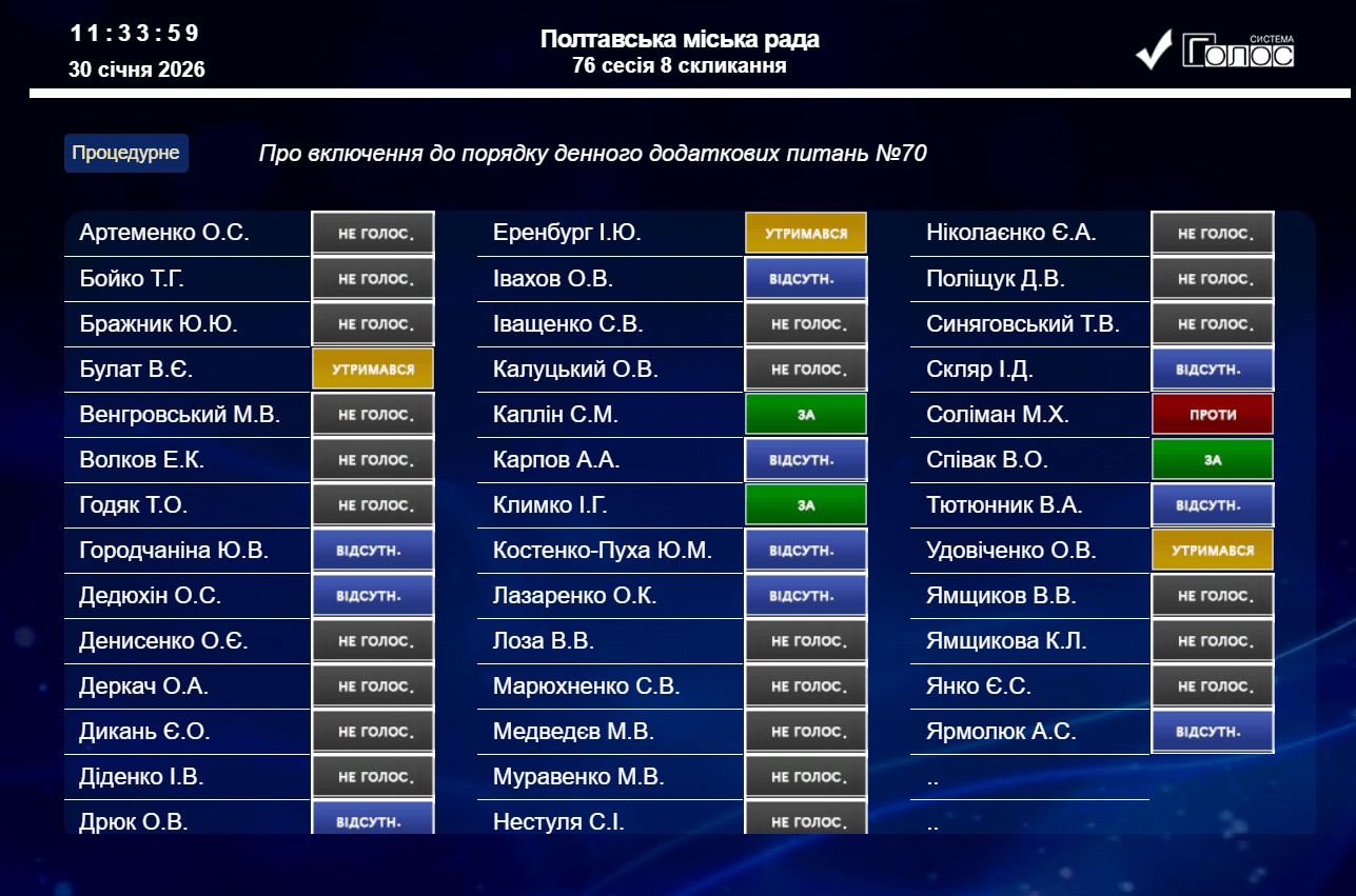 - 69) Про звернення депутатів Полтавської міської ради до Офісу Генерального прокурора, Міністерства внутрішніх справ України, Державного бюро розслідувань щодо вжиття заходів по припиненню триваючої бездіяльності слідчих Полтавського ГУП ГУНП в Полтавській області по кримінальних провадженнях №12025170420001589 від 19.12.2025 та № 12025170420001506 від 28.11.2025. Деталі.