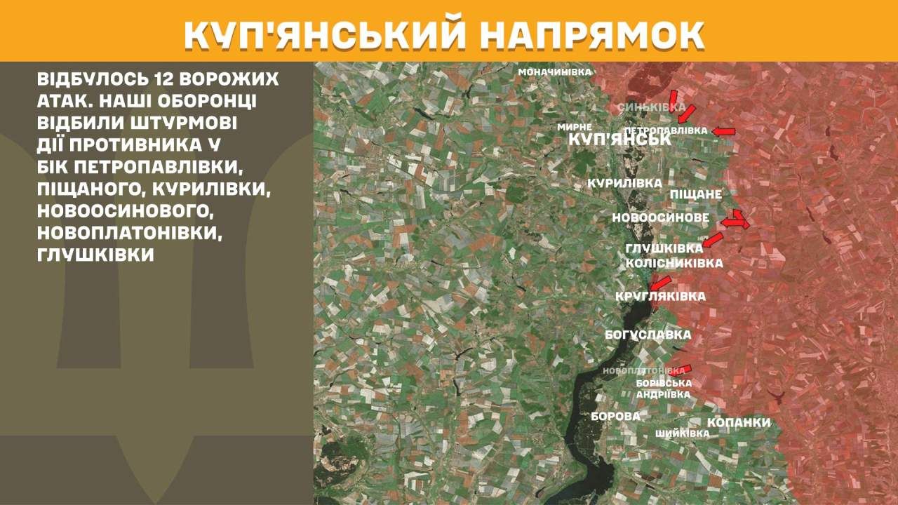На Куп’янському напрямку вчора відбулось 12 ворожих атак. Наші оборонці відбили штурмові дії противника у бік Петропавлівки, Піщаного, Курилівки, Новоосинового, Новоплатонівки, Глушківки.