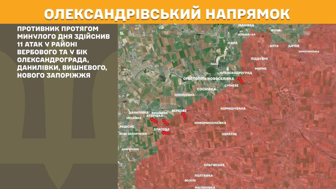 На Олександрівському напрямку противник протягом минулого дня здійснив 11 атак у районі Вербового та у бік Олександрограда, Данилівки, Вишневого, Нового Запоріжжя.