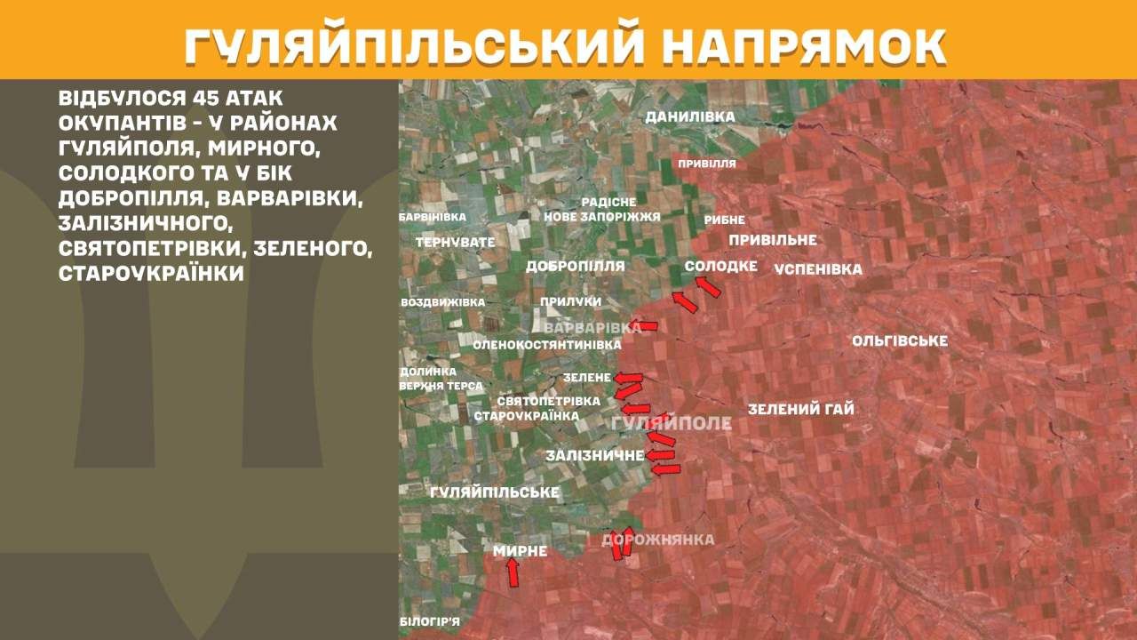 На Гуляйпільському напрямку відбулося 45 атак окупантів — у районах Гуляйполя, Мирного, Солодкого та у бік Добропілля, Варварівки, Залізничного, Святопетрівки, Зеленого, Староукраїнки.
