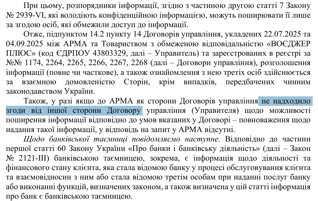 Раніше Агентство відкрито публікувало дані про конкурси та очікувані прибутки. Однак, коли «Полтавщина» надіслала запити з проханням підтвердити фактичні надходження та уточнити статус інших об’єктів (зокрема, готелів «Алея Гранд», «Баварія», ресторану «Козачка»), АРМА відповіло відмовою.